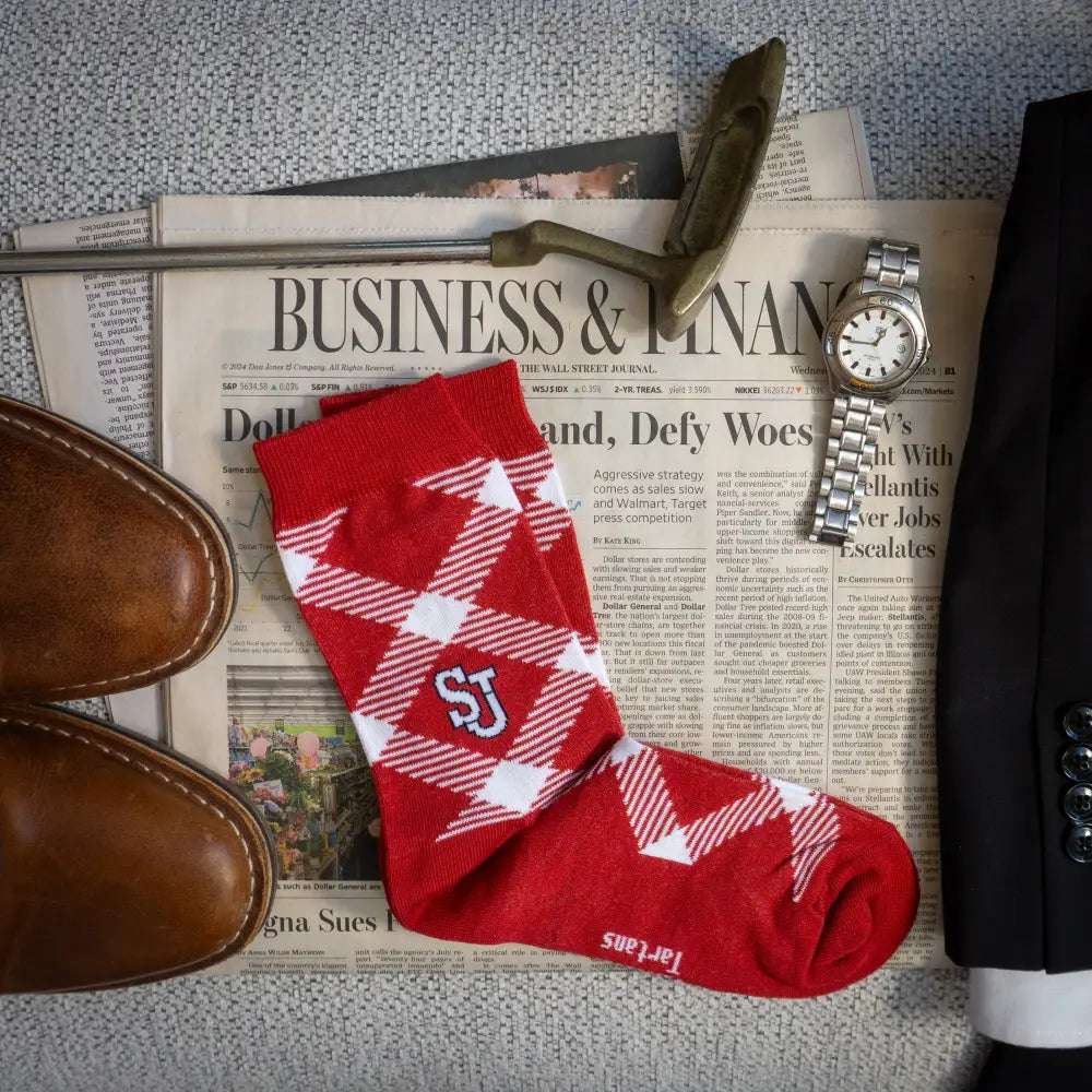 Would you like to showcase your school spirit and add an exciting pop to any outfit? Timeless Tartans socks are sure to become a staple in your wardrobe. Our patented algorithm combines St. John's founding year and campus coordinates with its official colors to create a unique, meaningful tartan pattern you’ll cherish for years to come.