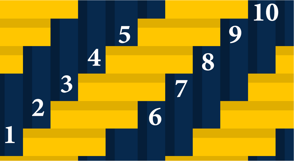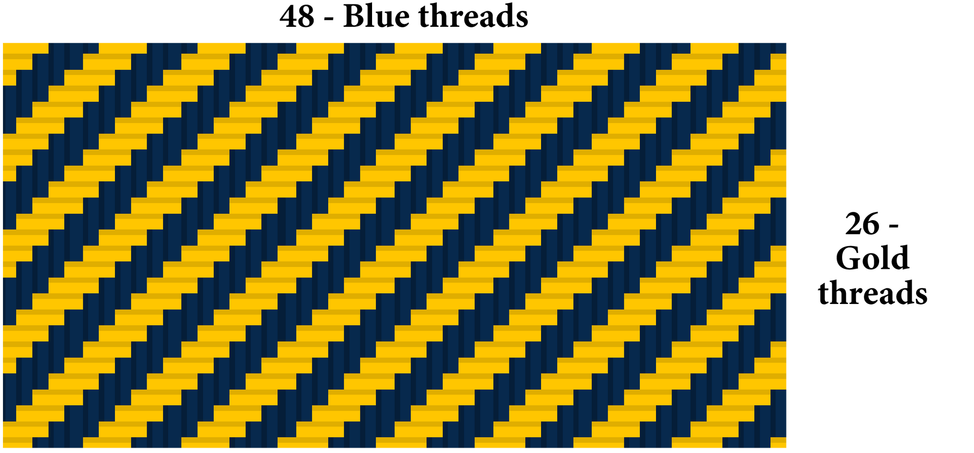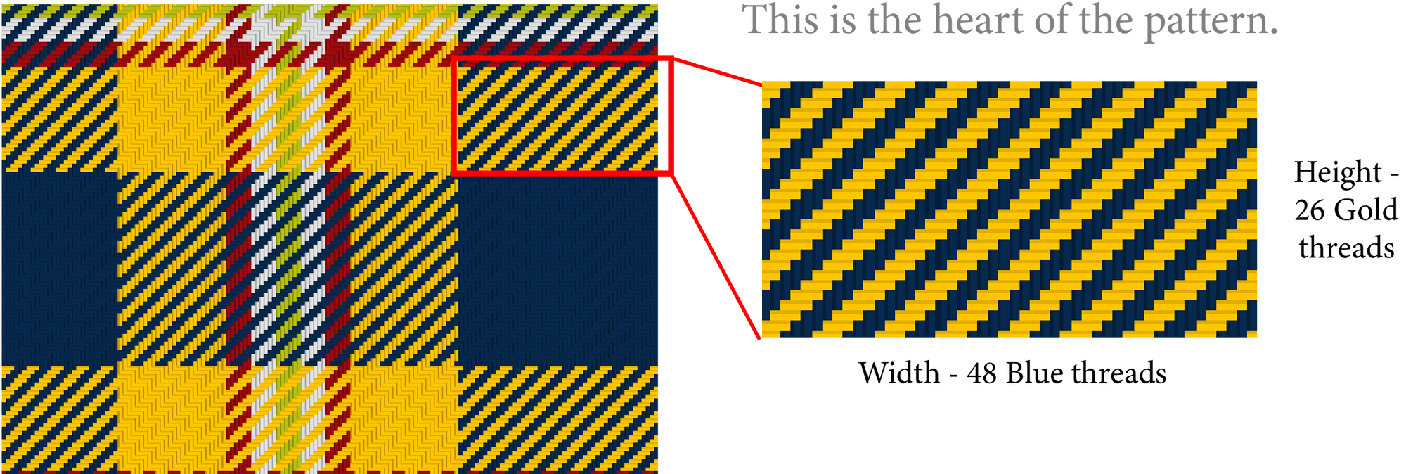 *Note: The rounded-up differences in Step 2 (0.673 for Blue) and Step 4 (0.850 for Gold) are the unique "modification codes" for this tartan. They enable you to decode the pattern by dividing the year founded (i.e. 1891) by the number of modified Blue threads (48-0.673) and Gold threads (26-0.850) to arrive back at the respective geo-coordinates - 39.956 W and 75.189 N.